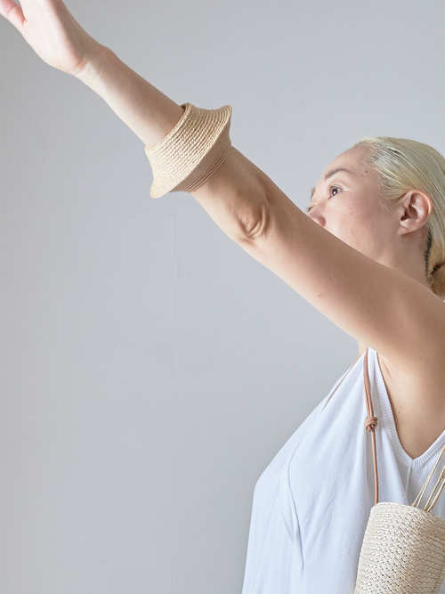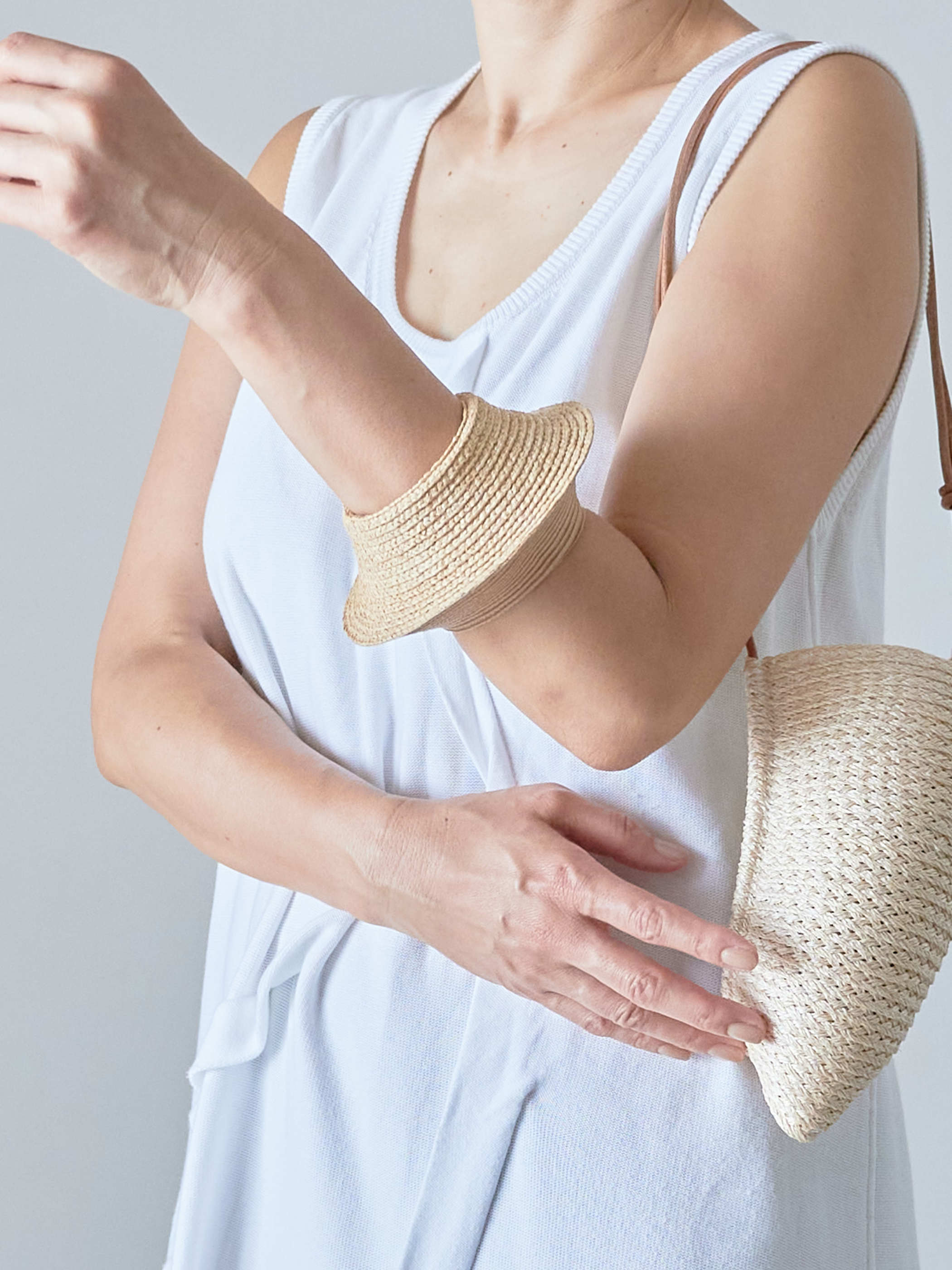 手元のコーディネートに天然素材を取り入れることで抜け感を出せます。